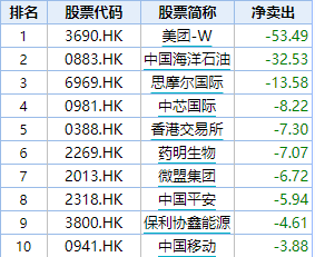 本周,南下资金继续抛售美团53.49亿港元,位列抛售额第一。此外,南下资金还抛售中国海洋石油32.53亿港元,位列抛售额第二。思摩尔国际、、中芯国际、香港交易所等个股也遭到抛售。