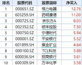 本周北上资金买入金额最多的标的为格力电器,一周净买入12.76亿元。药明康德也获11.00亿元,京东方A获净买入8.03亿元。顺丰控股、宁德时代、平安银行、紫金矿业等也获港资加仓。
