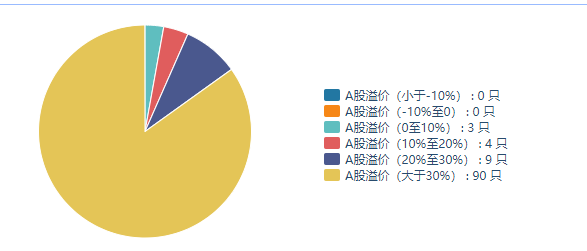 本周有90只A股溢价超过30%,9只溢价在20%至30%之间,4只在10%至20%之间,有3只溢价在10%之内。
