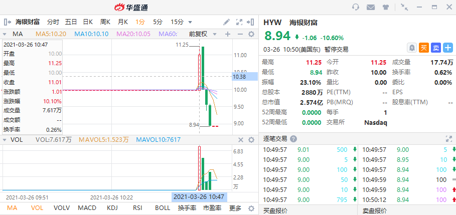 华盛资讯3月26日讯,海银财富今日正式登陆美股,开盘涨幅一度拉升至10%。截至发稿,该股跌10.6%,报8.94美元。