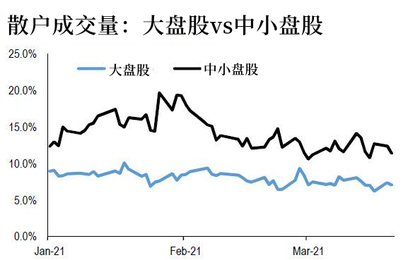 2. 相对于整个市场订单的交易数量,散户投资者仍然倾向于中小盘股,而非大盘股。
