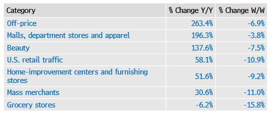 数据显示以下更多细节:在跟踪调查的六个类别中,特价商品的浏览量上涨263%,商场、百货公司和服装上涨196%,这些是涨幅最大的。杂货店是唯一下降的,下降了6.2%。