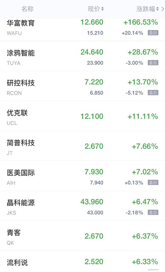 涂鸦智能涨28%,腾讯ADR、京东涨超4%,名创优品、陌陌涨超3%,拼多多涨近3%,网易、阿里巴巴涨超2%。哔哩哔哩涨超1%。