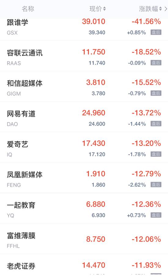 中概股教育股中,跟谁学跌超41%,盘中跌幅一度达到55%。网易有道跌超13%,新东方跌11%,好未来跌7%;华富教育飙升166%,四季教育涨34%,流利说涨超6%。