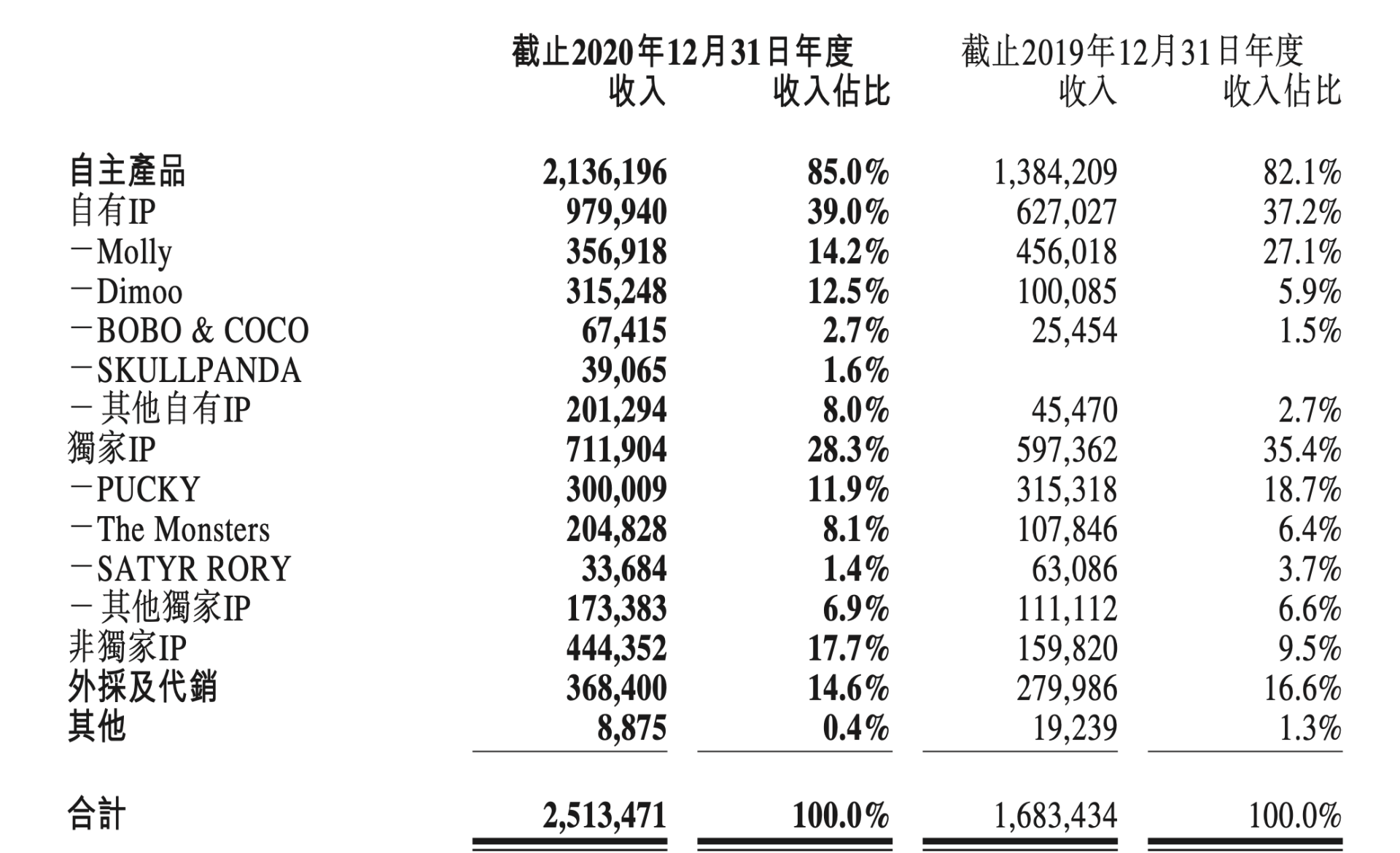 但是,并不能由此得出结论说,泡泡玛特的IP运作策略已经比较成熟。值得注意的是,独家IP“SATYR RORY"就没那么顺利,2020年收入几乎腰斩,此外,自有IP“Yuki”更是没有出现在财报里,而在2019年,它贡献了1500余万元的收入。而头部IP“MOLLY”2020年的收入未增反降,由2019年全年的4.6亿元,降至2020年的3.6亿元。