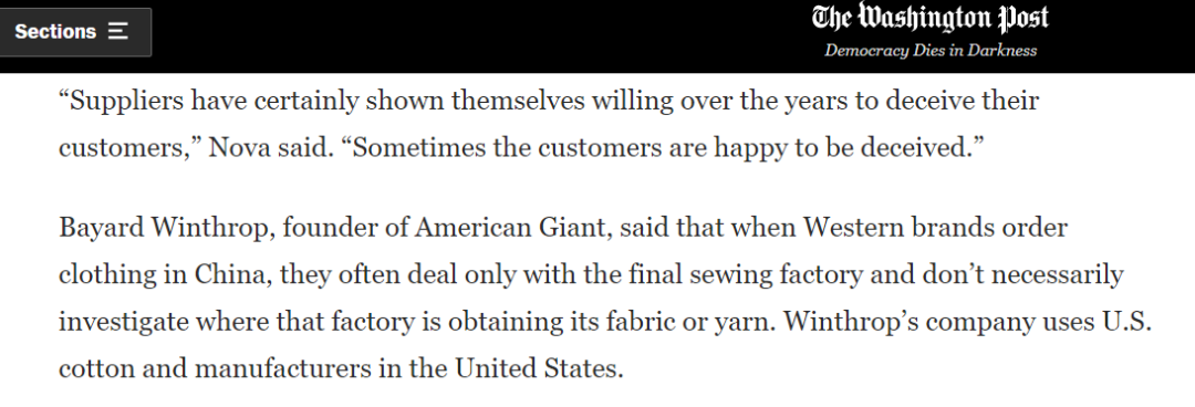 该报采访的一些“劳工组织”的人就称供应商很擅长“欺骗”他们的客户。一家在美国本土生产的服装品牌还称西方品牌一般在中国也不是直接与原材料供应商打交道,所以无法确保原材料没问题,不如直接用他们这个美国本土的服装。