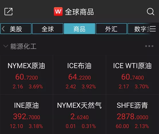 国际油价也大幅波动四天,周五双双涨超3%,美油WTI一度冲破61美元,国际布伦特油价重返64美元上方。