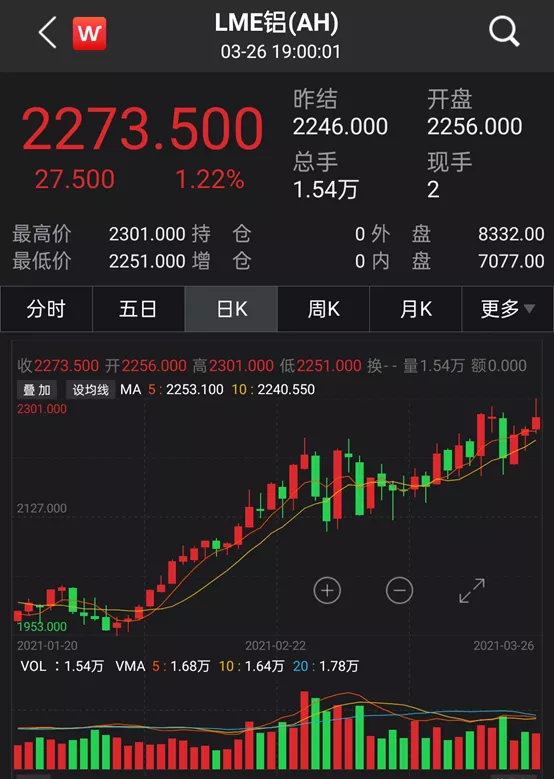 工业用基础金属也正在受到波及,特别是铝价。周五LME铝收涨1.22%,报2273.5美元/吨,盘中一度突破2300美元,刷新逾两年半高位。
