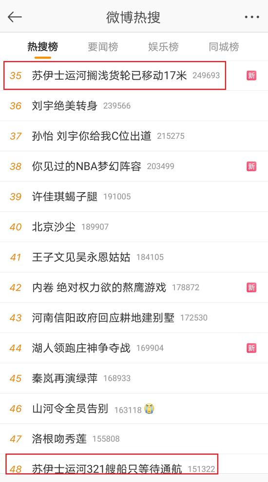 3月28日,#苏伊士运河搁浅货轮已移动17米#和#苏伊士运河321艘船只等待通航#登上新浪微博热搜榜,引发网友关注。