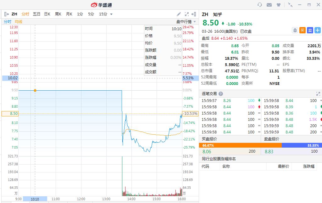 美东时间3月26日,中国在线问答平台知乎正式在纽交所上市,证券代码为“ZH”,IPO发行价定为每股ADS 9.5美元,募集资金共计8.5亿美元(全额行使超额配售权后)。开盘后知乎跌超20%,收盘跌11.16%至8.44美元,总市值47.18亿美元。