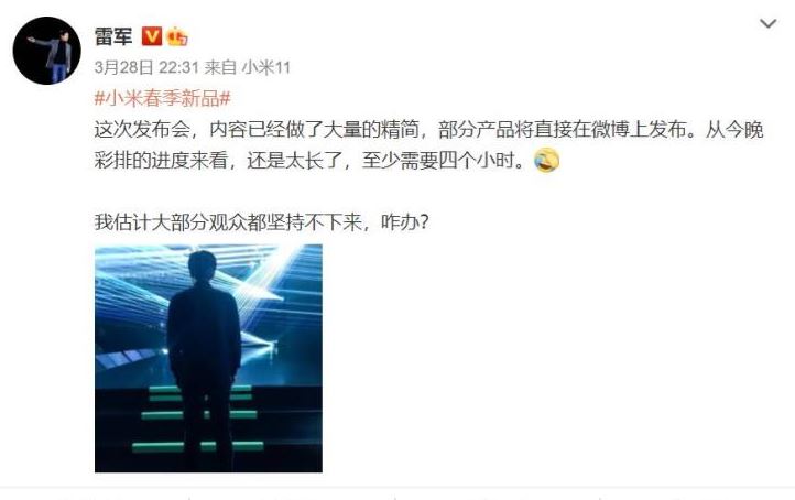 据小米 CEO 雷军微博表示,今晚召开的小米春季新品发布会将需要至少4个小时。小米称将在发布会上推出新款自研芯片。此前有爆料称,这次小米有望发布小米11Pro、小米11Pro+两款旗舰手机。