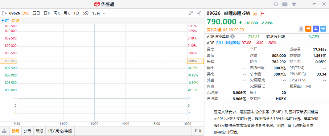 华盛资讯3月29日讯,哔哩哔哩-SW(09626.HK)今日首挂低开2.23%,报价790.00港元,一手账面亏损360港币,成交额1.361亿港元,最新市值达3007亿港元。