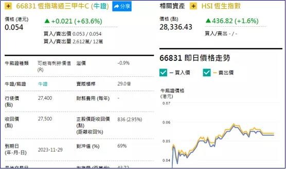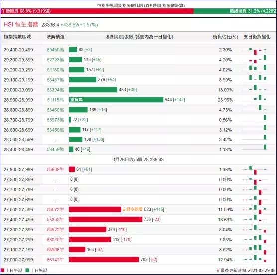 街货分布方面,至上周五,恒指牛证街货在收回价27200点至27600点之间,累计相当约2051张期指合约;恒指熊证街货相对分散,在收回价28400点至29100点之间,累计相当约1939张期指合约。