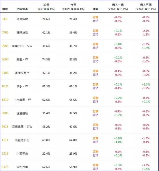上周五恒指相关权证的平均引伸波幅约21.4%,按日下降3.2个百分点。个股方面,腾讯、美团、小米、比亚迪等相关认购证的引伸波幅均按日有所调升,及其相关认沽证的引伸波幅则按日调降;而近一周变化方面,多数均呈现下降趋势。