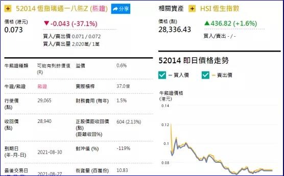 2、看错方向:恒指瑞通一八熊(52014.HK),上周五大跌37.07%。