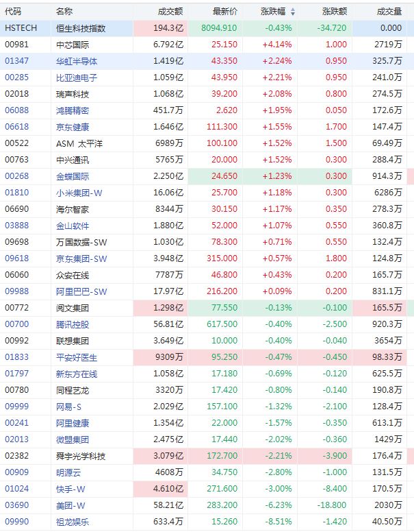 华盛资讯3月29日消息,恒生科技指数盘中走低,现报8094.91点,跌0.43%。南方恒生科技跟跌0.25%。芯片股走强,中芯国际涨4%,华虹半导体涨2%,ASM太平洋涨超1%。中兴通讯、小米涨超1%;此外,快手跌超3%,美团跌超6%失守300港元。