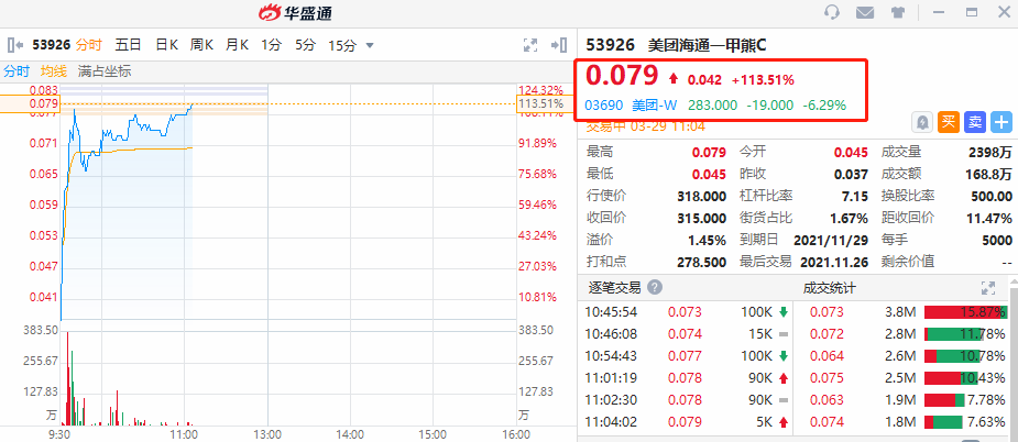 相关窝轮方面,美团海通一甲熊C大涨超110%,成交额168.8万港元,其行使价为318港元,2021年11月26日到期,距回收价11.47%。