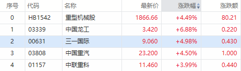 华盛资讯3月29日消息,重型机械古板块早盘集体上涨。截至发稿,中国龙工上涨超6%,三一国际上涨超4%,中国重汽上涨超4%,中联重科上涨超3%。