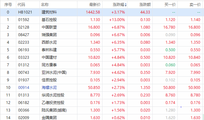 华盛资讯3月29日消息,今日建筑材料板块表现强势。截止发稿,基石控股涨13%,中国联塑涨超6%,西部水泥涨超6%,中国建材涨超4%,海螺水泥涨超2%。