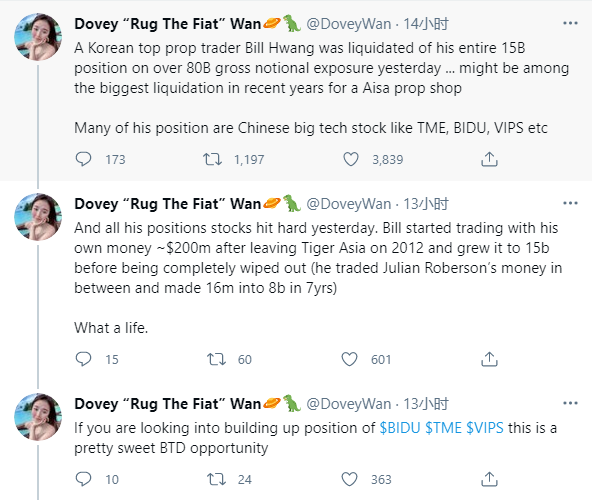 上周五,高盛集中抛售价值百亿美元的股票,其中含百度、腾讯音乐和唯品会等多只中概股,摩根士丹利亦在大举抛售类似股票。这一不寻常的举动,引起市场高度关注。华尔街相当多人士将其归因为少数对冲基金爆仓,主流媒体将源头锁定为韩裔对冲基金经理Bill Hwang管理的Archegos Capital Management LLC出现爆仓。