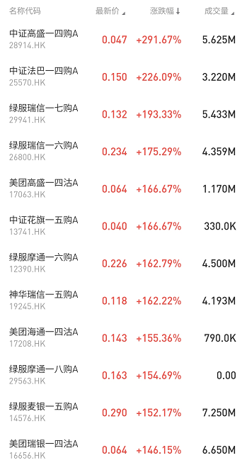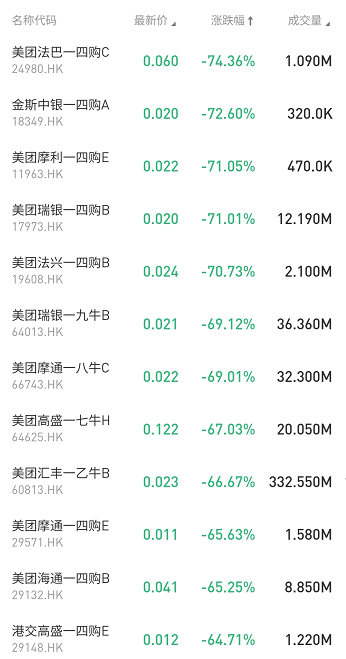 数据显示,美团共有13只沽证涨幅在100%以上(包括100%)。