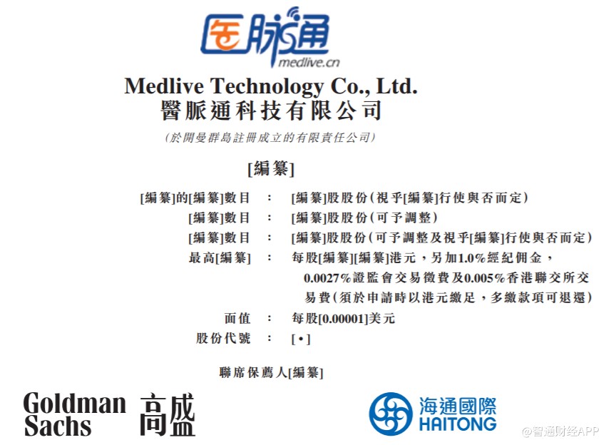 3月29日,医脉通科技有限公司向港交所主板递交上市申请,高盛及海通国际为联席保荐人。