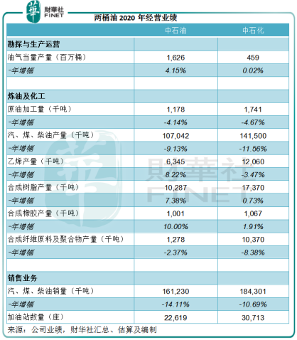 勘探与生产运营方面,中石油和中石化的2020年油气产量仍有轻微增幅(见下表),中石油在这个业务板块较具优势,毛利率达到17.3%;中石化的毛利率只有7.1%,因勘探与生产业务规模显著小于中石油,该公司主要从事炼油业务。
