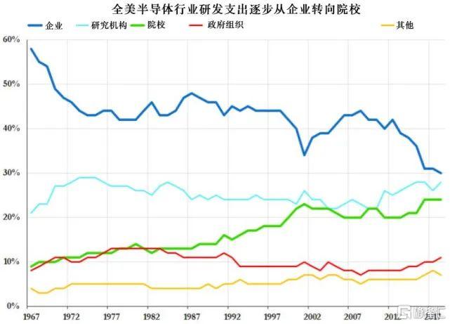 取而代之的是,政府支出更少,并试图开创一种劳动分工机制,允许所有参与者在不牺牲技术前沿领先地位的情况下削减成本,并追求盈利。为了做到这一点,它一方面资助学术研究实验室进行研发,另一方面资助行业团体将研究转化为商业能力。在某种程度上,这进一步降低了单个公司的研发投资。