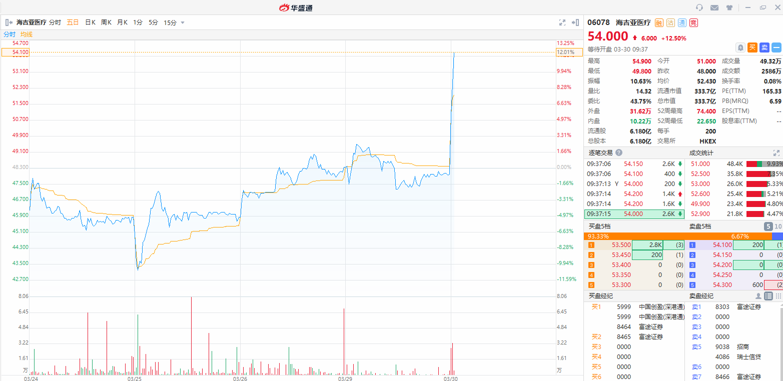 华盛资讯3月30日消息,海吉亚医疗今日高开高走。截至发稿,海吉亚医疗涨12.5%,现报54.00港元,成交额达2586万港元,当前市值为333.7亿港元。
