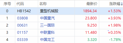 华盛资讯3月30日消息,受挖掘机市场销售火热,排单饱满影响,重型机械股早盘快速拉升。截止发稿,重型机械股板块上涨1.53%,板块内中国重汽涨超3%,三一国际涨超1%。