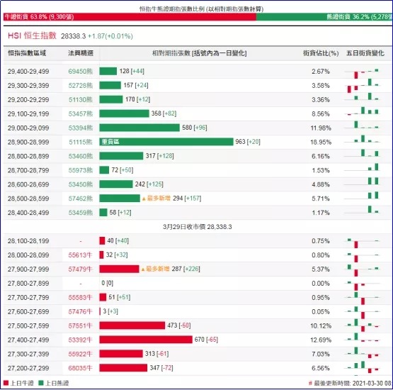 街货分布方面,至周一,贴价恒指牛证相对稀疏,街货主要在收回价27200点至27600点之间,累计相当约1803张期指合约;恒指熊证街货在收回价28400点至29200点之间,累计相当约2884张期指合约。