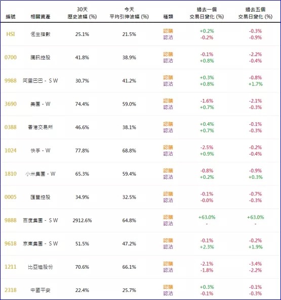 周一恒指相关权证的平均引伸波幅约21.5%,按日变动不大。个股方面,阿里巴巴、港交所、百度相关认购证的引伸波幅均按日调升;腾讯、阿里巴巴、美团、港交所、快手、京东相关认沽证的引伸波幅亦有所调升。