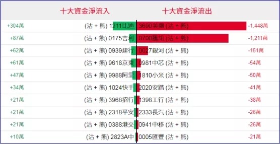 淡仓(认沽证及熊证)方面,周一比迪、吉利、建行相关淡仓约少量资金净流入部署;美团、腾讯相关淡仓则分别约1448万、1211万港元资金净流出套现。