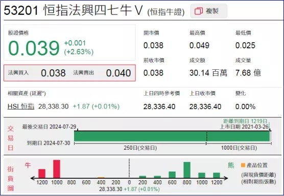 1、强势轮证:恒指法兴四七牛(59238.HK),周一收涨2.63%;