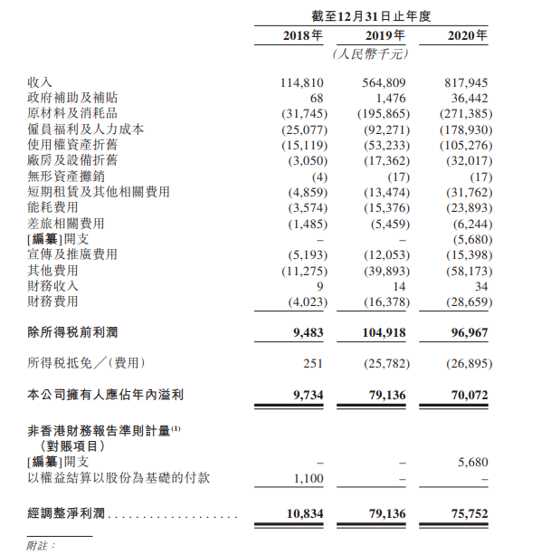 以往绩记录期内,该公司保持着强劲的财务表现。于2018年, 2019年及2020年,海伦司收益分别为人民币1.148亿元、5.648亿元和8.179亿元,年复合增长率达到166.9%;净利润分别为人民币1083万、7914万和7575万,2019年增长率达730%。尽管在2020年上半年, 新冠疫情及有关防控措施对该公司的业务造成了一定影响,然而在中国大陆疫情得到初步控制后,该公司的业务迎来了强劲的复苏。2020年的单月收益自4月的人民币3630万元持续增长至12月的人民币1.396亿元,全年收益亦仍实现了44.8%的同比增长。