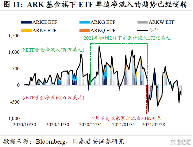 随着美联储正式将削减QE摆上桌面进行讨论,流动性退潮预期下,比特币价格面临重估风险;随着美债利率上行仍有空间,美股盈利预期的正面影响将逐步衰弱,利率预期的负面影响将逐步增强,考虑到年初以来盈利预期已经打得较高、下半年美联储将进一步释放收紧信号,美股尤其科技股下跌风险正在加大;随着ARK基金旗下ETF资金单边净流入的趋势已逆转,负债端不稳,大量抛售的反身性可能导致净值进一步下跌。