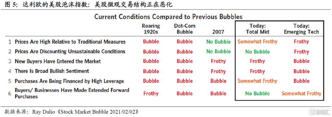 桥水基金创始人雷·达利欧(Ray Dalio)通过六个量化指标来观测从1910年以来美股的泡沫程度,目前约位于77%历史分位数,1929年大崩盘前和2000年互联网泡沫破裂前则对应100%的水平。