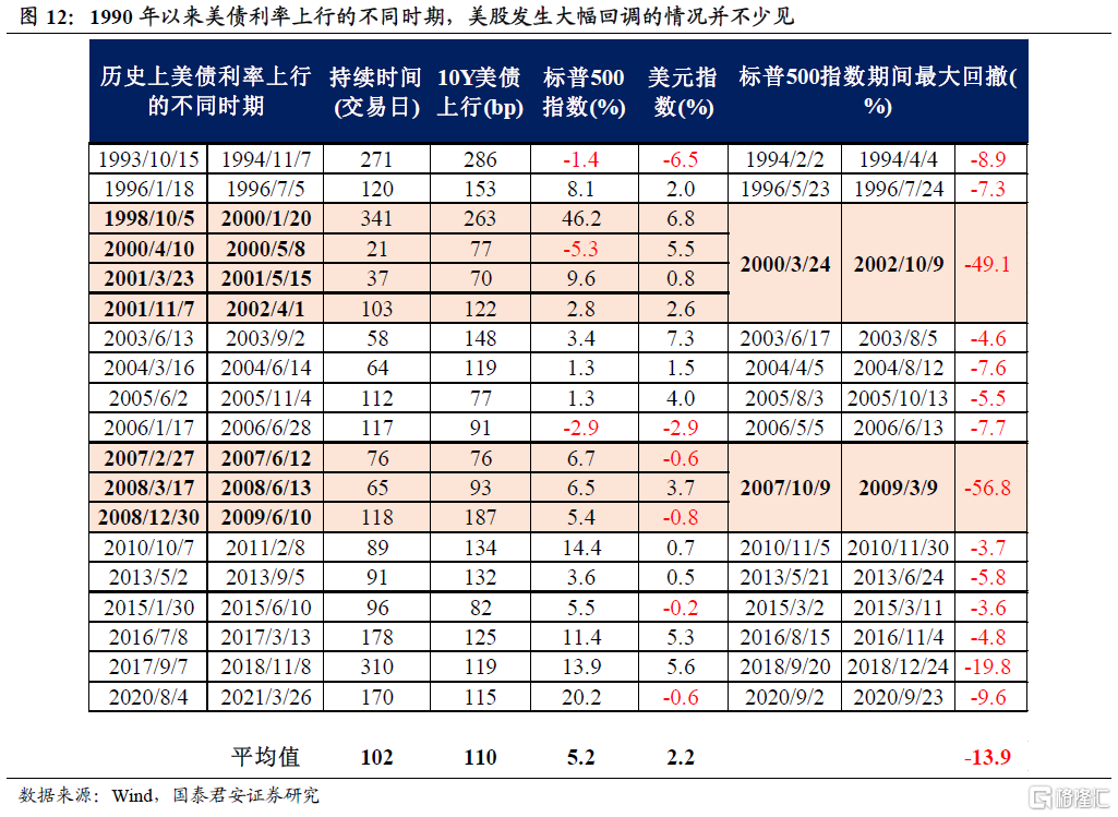 回顾1990年以来美债利率上行的不同时期,单独靠美债利率上行本身并不一定导致美股崩盘,但是美股发生大幅回调的情况并不少见。1998年10月至2000年1月,10Y美债累计上行263bp,而互联网泡沫则在2000年3月破灭,标普500指数最多下跌49.1%;2017年9月至2018年11月,10Y美债累计上行119bp,尽管标普500指数累计上涨13.9%,但是发生过三次大幅下跌,分别是1-2月的-10.2%、3-4月的-7.3%、9-12月的-19.8%,尤其四季度暴跌引发美联储加息周期提前结束并转向宽松。