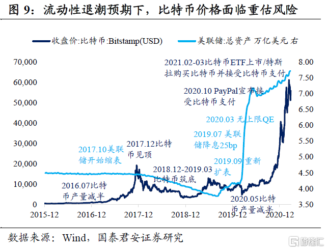 随着美联储正式将削减QE摆上桌面进行讨论,流动性退潮预期下,比特币价格面临重估风险。由于看好虚拟货币和区块链技术的前景,比特币作为另类资产的价值越来越被海外机构所认可,考虑到比特币产量每四年缩减一半(目前已完成三次减半),部分观点甚至将其看成“数字黄金”。但2020年以来的比特币大牛市,除了产量减半、机构接受度迅速提升、散户大量涌入等因素,本质上仍是全球流动性泛滥所推动的,这可以从比特币价格走势和美联储总资产规模的正相关性看出。上轮牛市的顶部(2017年12月)就发生在美联储开始缩表后(2017年10月),见顶前最后一波上涨来自11月美国感恩节期间新入场的散户。