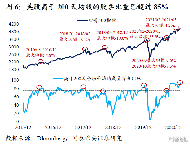 如果简单以技术指标来分析,衡量投资者相对乐观情绪的标普500指数看涨/看跌期权成交量之比,已经接近2015年以来均值的1倍标准差上方,而衡量上涨广度的标普500指数中价格高于200天均线的股票比例,已经超过85%,而2015年以来当这一指标超过75%,美股往往会出现回调,剔除2020年3月“股灾”后的平均回撤幅度在9.1%左右。