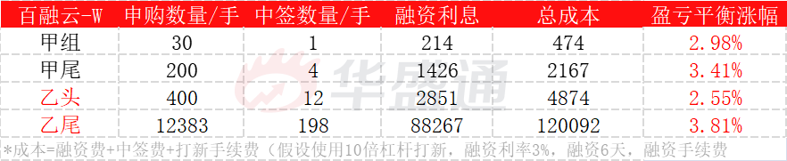 甲尾融资打新200手,利息1426港元,盈亏平衡点3.41%;