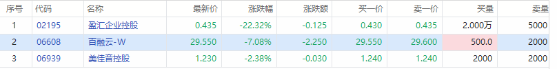 华盛资讯3月30日讯,百融云-W(09626.HK)、美佳音控股(06939.HK)、盈汇企业控股(02195.HK)暗盘交易正在进行。截至发稿,百融云报价29.55港元,跌7.08%,一手亏损1425港元;美佳音跌2.38%,盈汇企业跌22.32%,这三只新股将于明日正式上市。