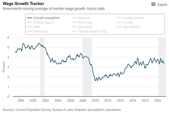 不过疫情冲击带来的失业,与过去的经济衰退期并不相同。比如基于亚特兰大联储的工资增长跟踪器,2021年1月,时薪工资中位数增速录得3.4%,而且保持稳定,这与过去衰退期的工资下滑明显不同。