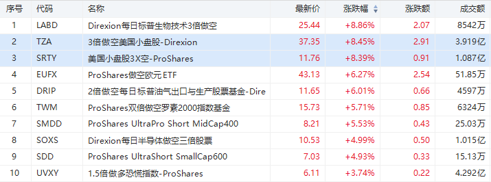 从ETF涨幅榜来看,涨幅居前的ETF主要与做空生物技术和小盘股相关,其中一只做空生物技术的LABD大涨8.86%,成交额8542万美元,该ETF近一周涨幅为40.24%;此外,还有两只做空美国小盘股的TZA和SRTY涨幅均超过8%,其中3倍做空美国小盘股的TZA成交额达3.919亿美元,另一只SRTY成交额达1.087亿美元。