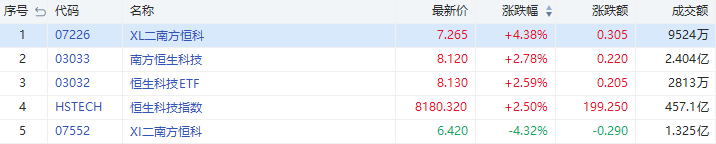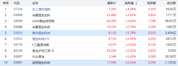 受消息影响,南方两倍做多恒生科技收涨4.38%,涨幅居前,成交额为9524万港元;南方恒生科技收盘上涨2.78%,成交2.404亿港元。