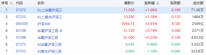 沪深300指数涨0.95%。其中,华夏沪深三百涨0.23%,成交额达4.633亿港元;南方做空沪深三百跌1.16%,成交323.8万港元。