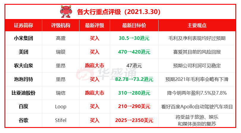 瑞银发表报告表示,美团股价自2月中旬高位累积调整34%后,该行喜爱其目前的风险回报,指其外卖及社区团购业务近期趋势巩固,并相信内地监管压力属于可控。该行指,美团去年第四季外卖业务营运毛利率按季及按年均有所改善,料其今年会进一步改善,维持对其「买入」评级,下调目标价由470元降至420元,相当今明两年市销率各11.5倍及8.3倍,与其他大型互联网同业估值相近。