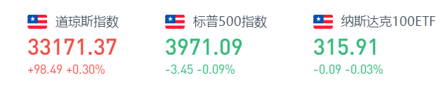 周一收盘,道琼斯指数涨98.49点,涨幅0.30%,报33171.37点,盘中和收盘再创历史新高;标普500指数跌3.45点,跌幅0.09%,报3971.09点;纳斯达克综合指数跌79.08点,跌幅0.60%,报13059.65点。