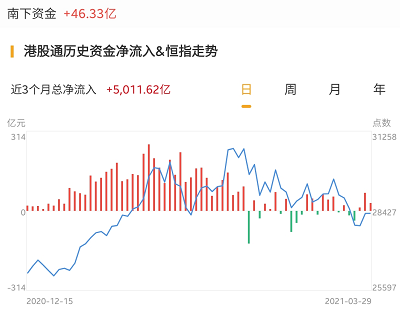 南下资金今日净流入港股高达46.33亿港元,周一为净流入近30亿港元。