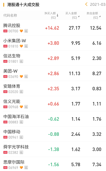 个股方面,今日南下资金净买入腾讯控股14.62亿港元,为今日买入之最。此外,南下资金净买入小米集团3.8亿港元,净买入信达生物2.89亿港元。